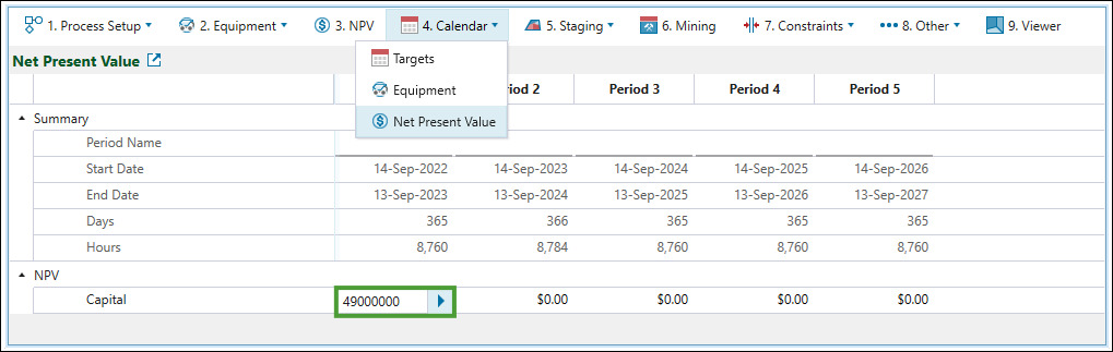 If any capital is to be applied, enter the amount into each period in the Calendar > Net Present Value tab.