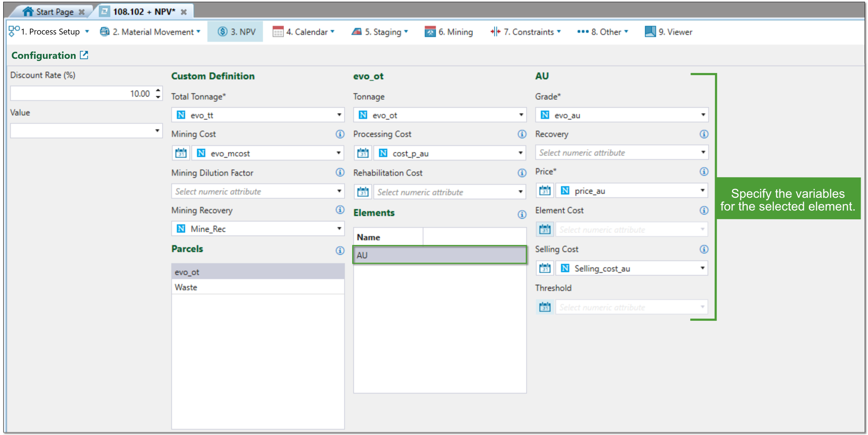 Select the required variables from the Total Tonnage, Mining Cost, Mining Dilution Factor, and Mining Recovery drop-down menus. The default custom definitions, based on the variables that you have initially specified for your setup, will be prefilled when you switch to this tab.