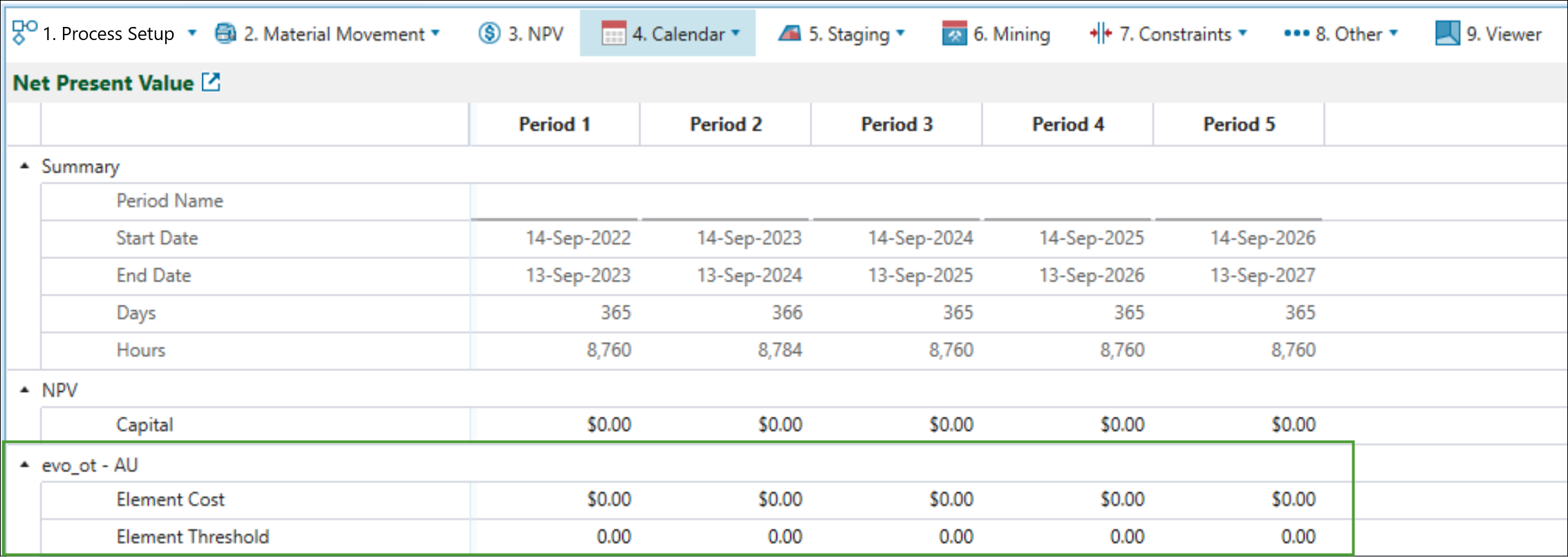 The Net Present Value (NPV) objective is used to evaluate the financial performance of a schedule during optimisation, which generates higher values based on costs and revenue.