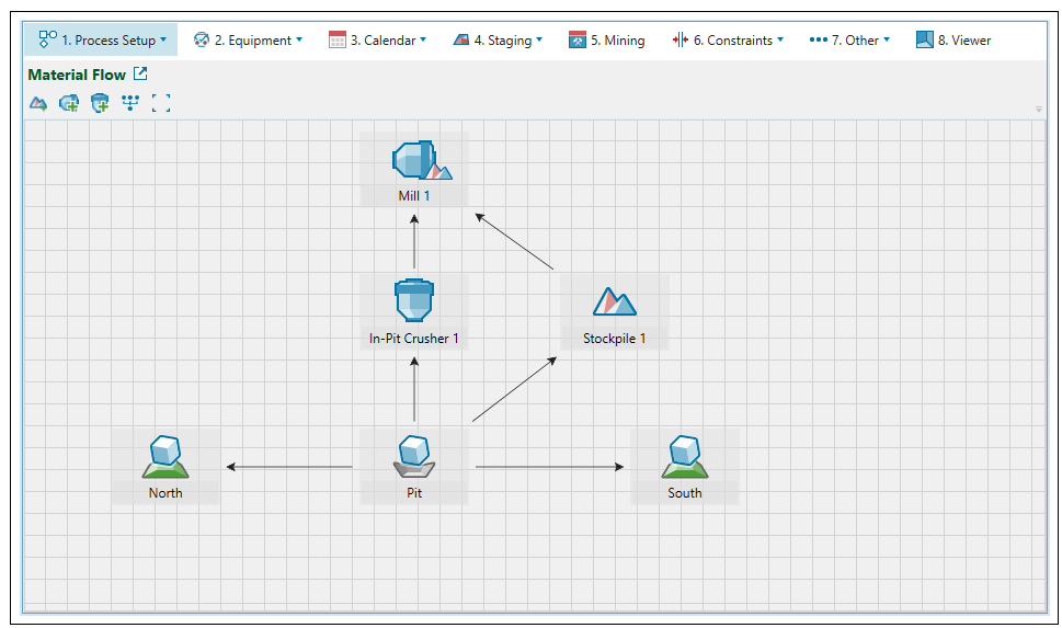 Material Flow subtab is used for adding process flow equipment to a setup and designing the flow of material.
