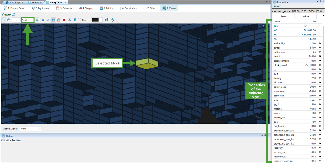 Once you select a block in the viewer, the Properties tab will display its attributes. The key attributes for block models (the X, Y, and Z value, stage, and Toe) will be pinned on top of the Properties tab.