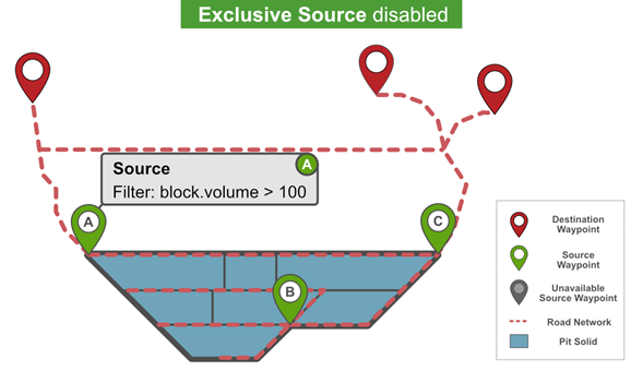Exclusive Source enabled If you enable Exclusive Source on a waypoint, all material that satisfies the filter criteria (for example, block.volume > 100, as shown on the image below) must pass only through the source waypoint.