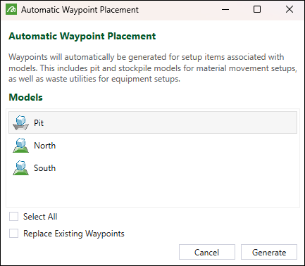 Opens the Automatic Waypoint Placement panel that allows you to automatically generate waypoints for setup items associated with imported models (pits, stockpiles, and waste utilities). You can select multiple models to generate waypoints for. To do so, click to select the required models while pressing the Ctrl key button.