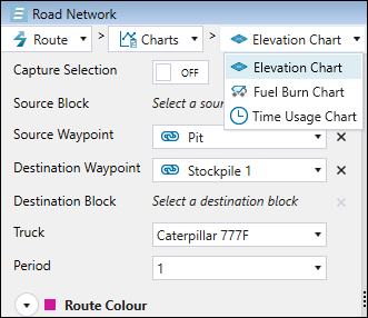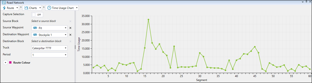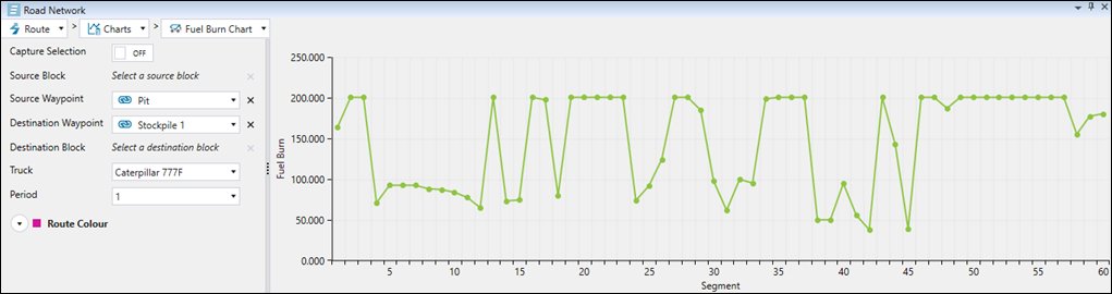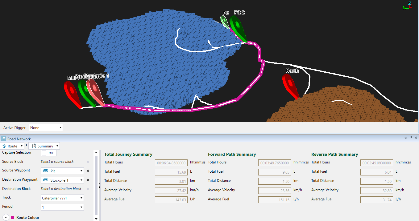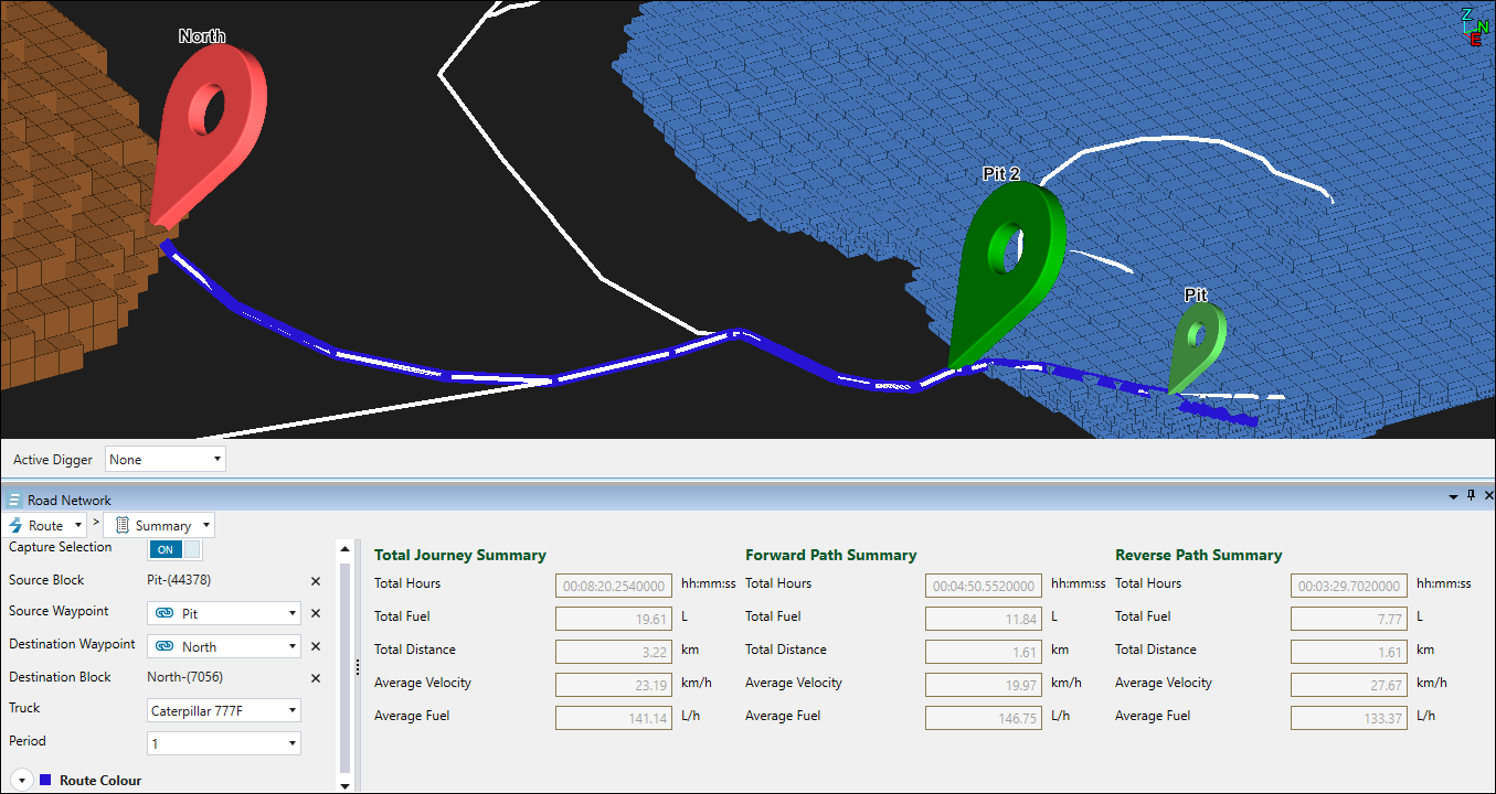To obtain information on the path between a source and destination block, enable the Capture Selection by clicking the toggle button. Select the Source Waypoint from the drop-down, and specify the Source Block by clicking on the required block on the source model. Next, select the destination waypoint and block the same way, and specify the truck and the period using the corresponding drop-downs. Evolution will automatically calculate the summary for total, forward and reverse paths, and mark the travelled route in the viewer.