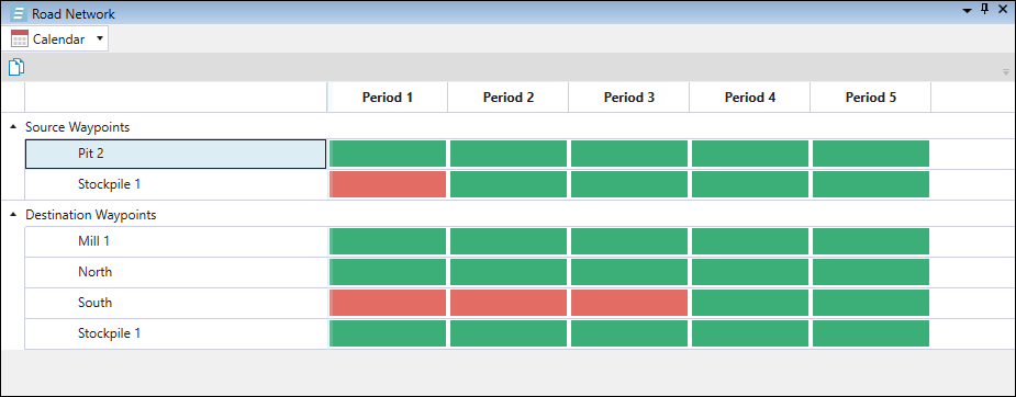 Calendar allows you to flag the availability of source and destination waypoints in each period. A green field indicates that the given waypoint is available in the corresponding period, whereas a red field indicates that the waypoint is unavailable. To change this setting, double-click on the cell and select either Available or Unavailable. To copy your calendar data to the clipboard (so it can be later pasted into another document), click the