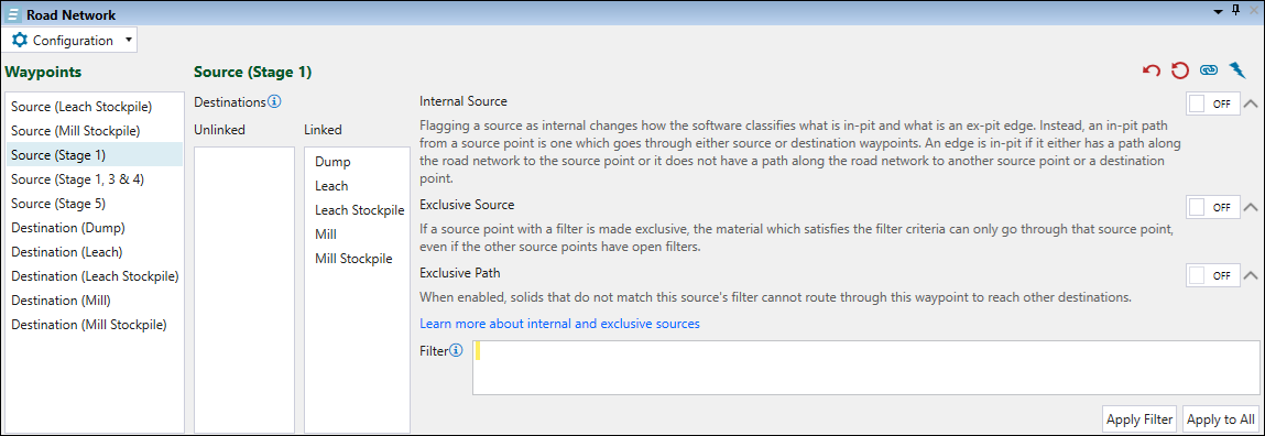 Exclusive Path: Flagging a path as exclusive ensures that an internal waypoint becomes a restrictive control point by preventing material that does not meet its filter conditions from passing through it. This option enforces strict filter behaviour so that material failing the waypoint’s conditions cannot cross that waypoint to reach other destinations. This setting is only applicable to internal sources (see Internal Source above for more information).