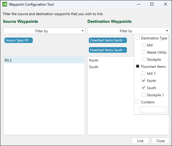 Click on the waypoint to link and unlink its destinations (for pits and stockpiles) or its sources (for stockpiles and waste dumps). A destination represents an exit point from the road network to a destination such as a mill, stockpile, or waste dump. A source waypoint represents a boundary between the in-pit and ex-pit path for a pit or an exit point of a stockpile.