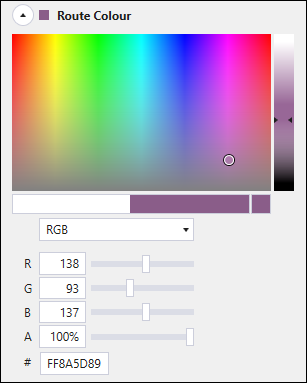 button to open the Route Colour editor. Choose the colour on the colour picker, or enter the code for the specific colour in the RGB, CMYK, HLS, or HSV format.