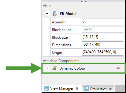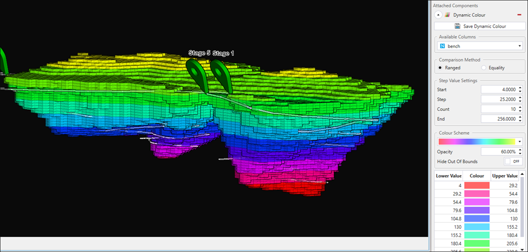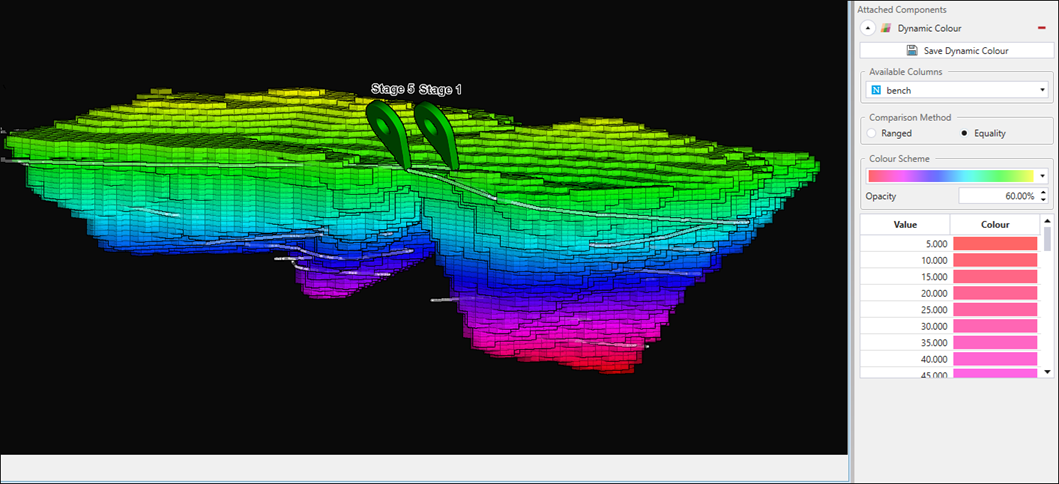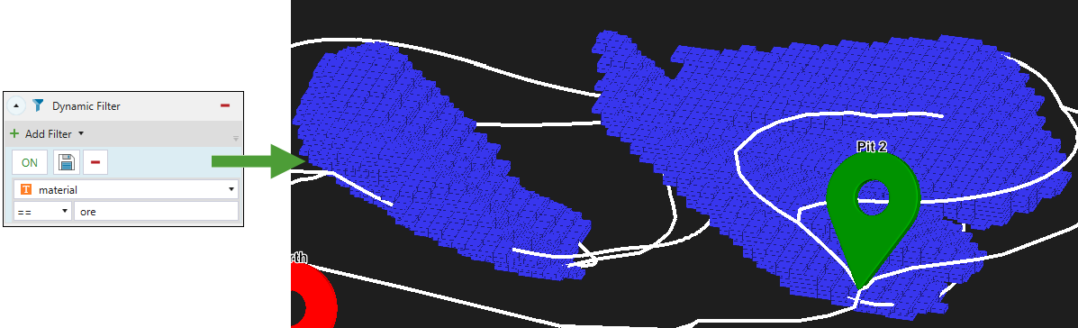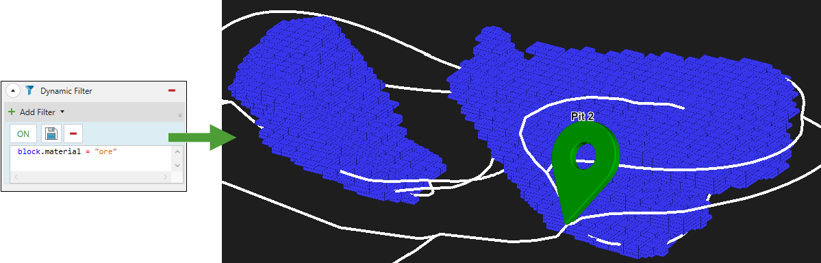 Allows you to customise the view of your model by applying a text value from the drop-down. In the example below, the model was filtered to display blocks containing ore.