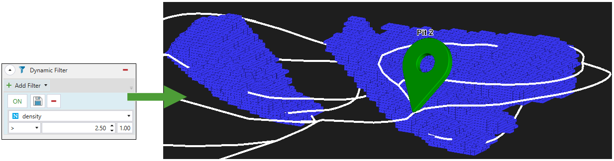 Allows you to customise the view of your model by applying a numeric value from the drop-down. In the example below, the model was filtered to display only the blocks with density greater than 2.5.