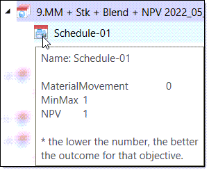 You can confirm the objective performance by hovering over the icon in the project explorer. A tooltip describing the performance of each schedule objective will appear.