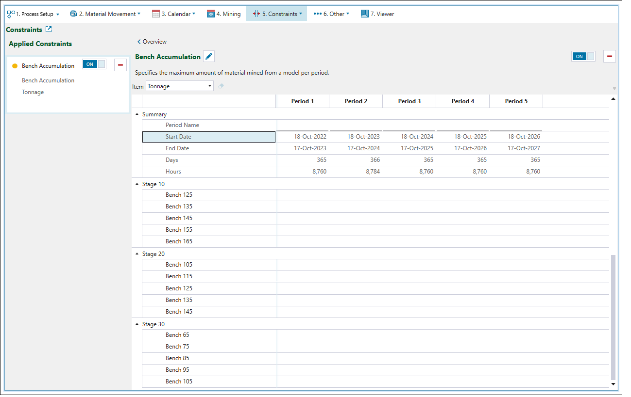 Use the Bench Accumulation constraint to set the maximum amount that can be mined per bench per period. Benches are grouped in terms of stage.