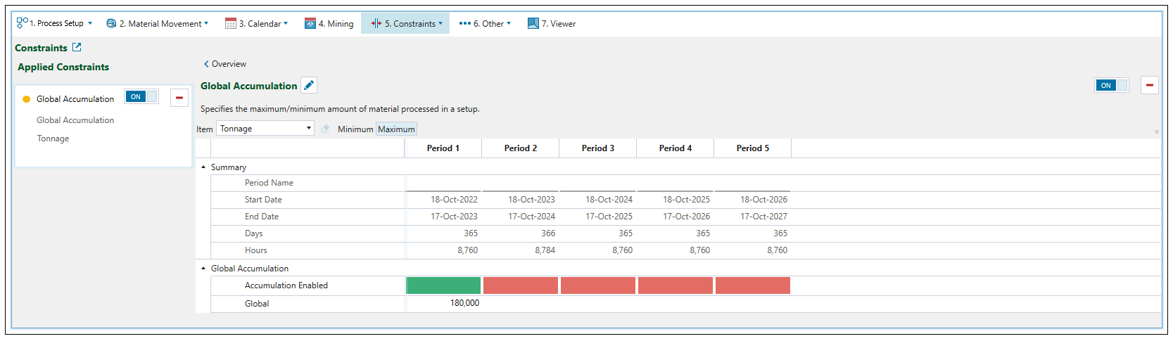 Use the Global Accumulation constraint to set a maximum/minimum volume or amount of tonnes that can be mined per period.