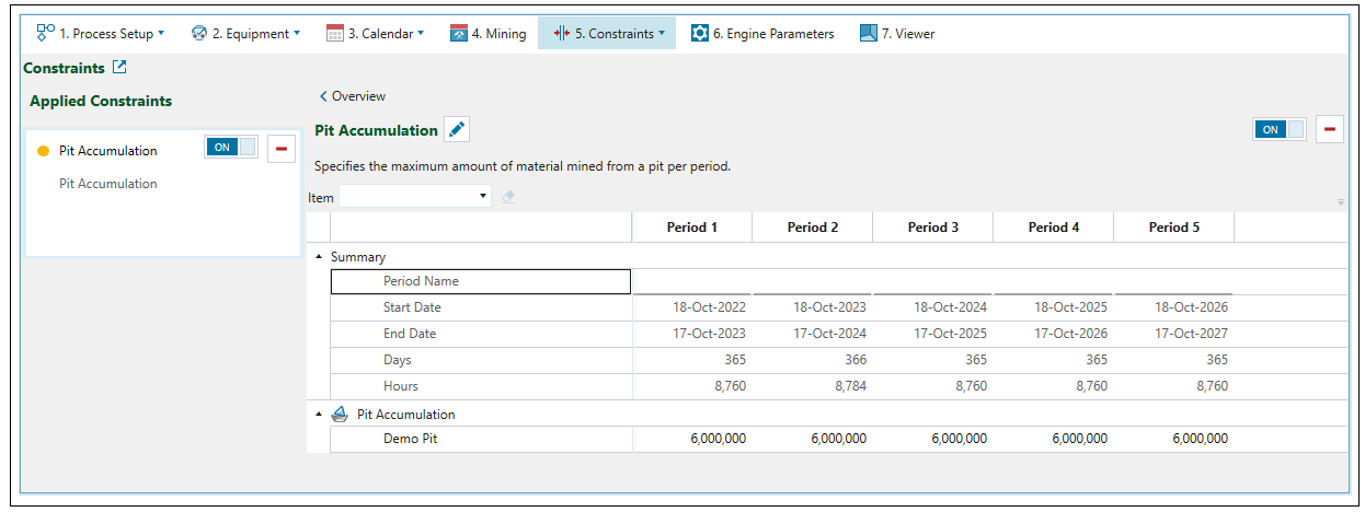 Use the Pit Accumulation constraint to define the maximum volume or amount of tonnes that can be mined per pit per period.