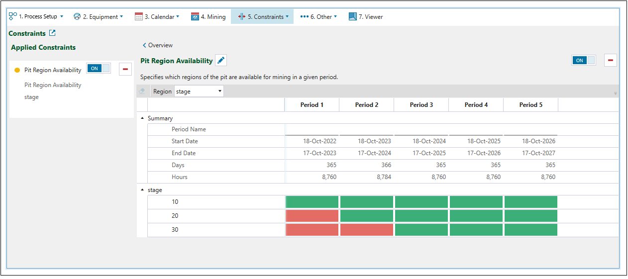 Use the Pit Region Availability constraint to make specific regions of a solid available to mine per period.