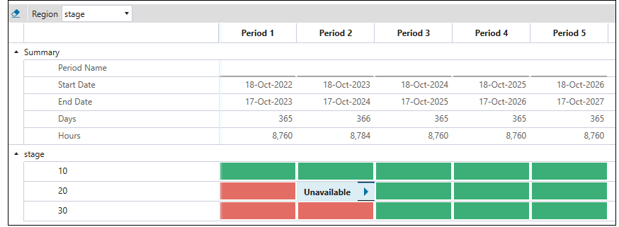 The stages that are available for mining in a given period are marked in green, whereas these that cannot be mined in a given period are marked in red. To change the region mining availability, double-click on the corresponding cell and select the required status.