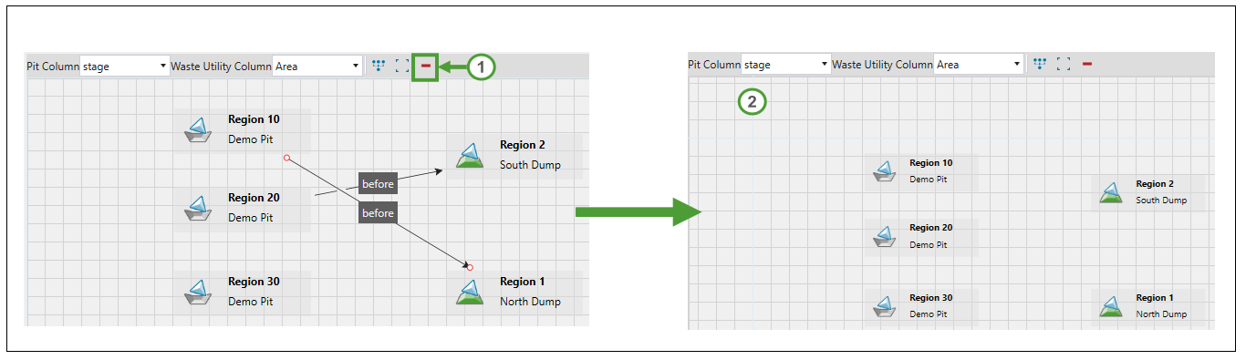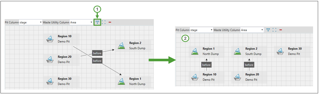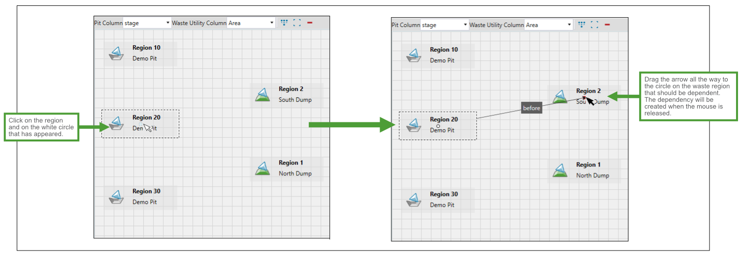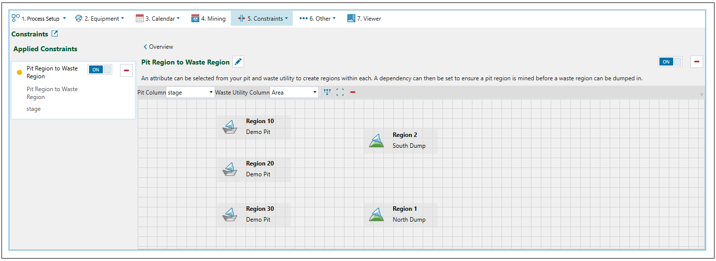 Use the Pit Region to Waste Region constraint to map regions in the pit to regions in the waste utility. This makes it possible to establish a dependency to ensure a pit region is mined before a waste region can be dumped in.