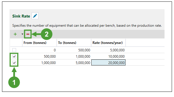 The Sink Rate is the mining duration per bench. It limits the vertical advance rate of the schedule based on the total tonnes available for mining on a bench and the corresponding dig rate.