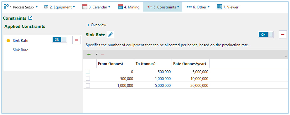 This constraint allows for variable dig or production rates based on definitions that you provide. For example, a bench may have just enough area and therefore tonnes for one digger per unit of area. In that case, you can define these values and reference a dig rate for the single unit. However, if the tonnes on a bench are more than this specified range, Origin will check the constraint setup and use the appropriate mining rate defined by the larger bench tonnage.