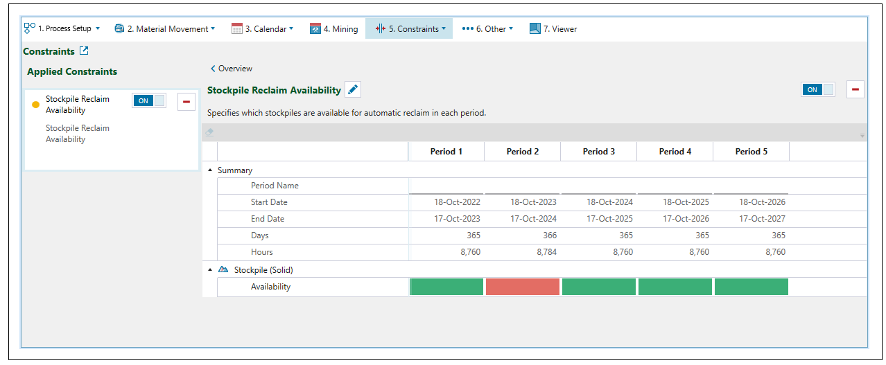 The Stockpile Reclaim Availability constraint is used to specify which stockpiles are available for automatic reclaim in each period.