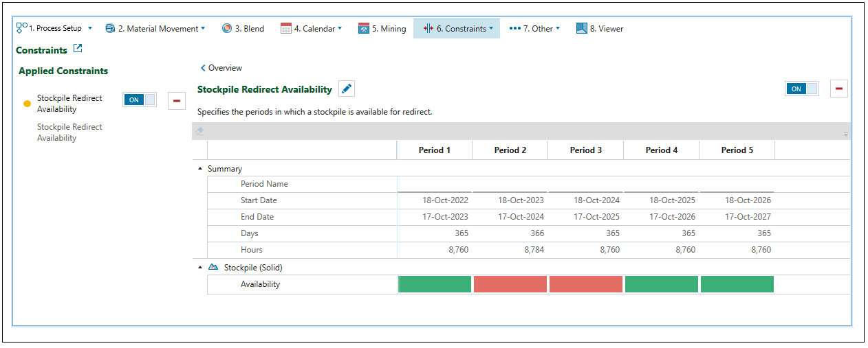 Use the Stockpile Redirect Availability constraint to specify the periods in which the stockpile material can be redirected to a mill.