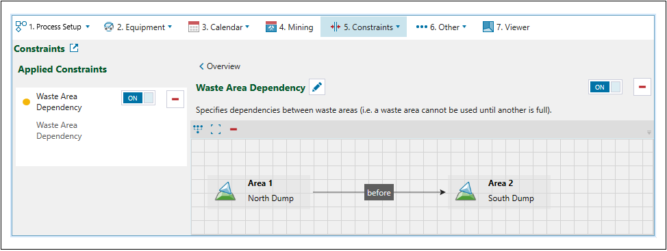 Use the Waste Area Dependency constraint to specify dependencies between waste areas. You can apply this constraint to both waste utilities and virtual waste dumps.