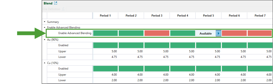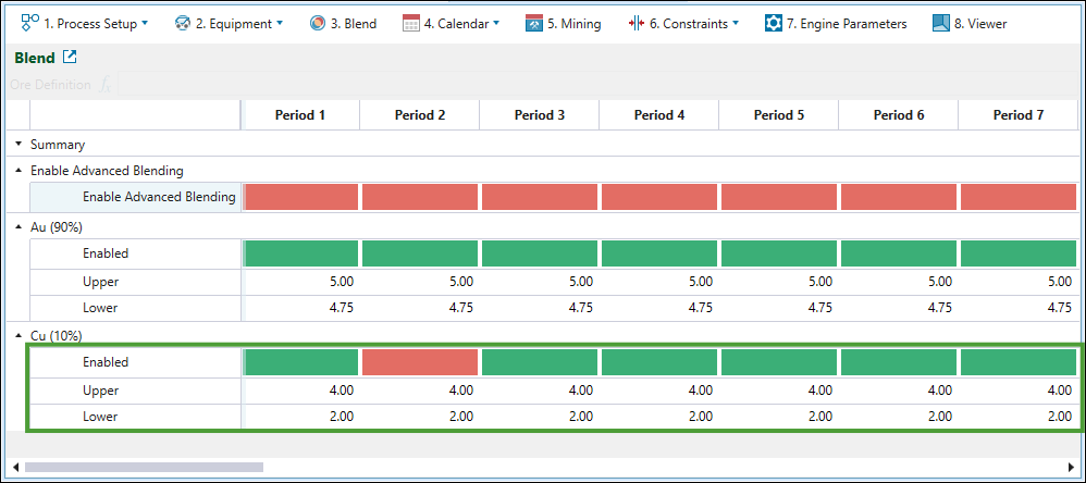 Blend subtab and set the range for mill processing by determining the upper and lower limits. You can also enable the blend target application in each period in the Enabled row.Note: The green fields indicate that the blend target is being applied in the corresponding period, whilst the red fields indicate that the blend target has been disabled for that period.