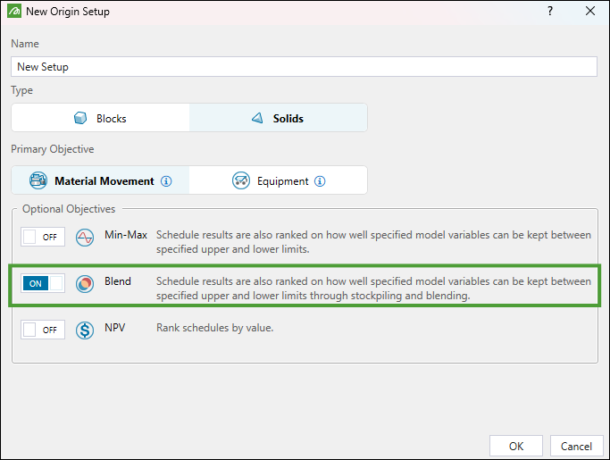 Origin Solids will try to achieve blend targets through prioritising mining sequences that produce better blend outcomes by redirecting material that was bound for a stockpile directly to a process and, optionally, by redirecting material between processes. In addition, if there are multiple stockpiles to reclaim from, Origin Solids will choose the best stockpile for meeting your blend target.