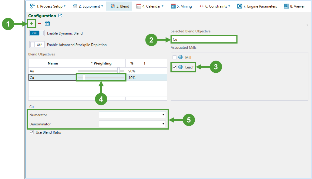 Important: Blending functionality might be restricted by the characteristics of your setup. For example, if you have applied Process Accumulation as the end of period target, redirecting material from the mill would cause the mill to work under its capacity.