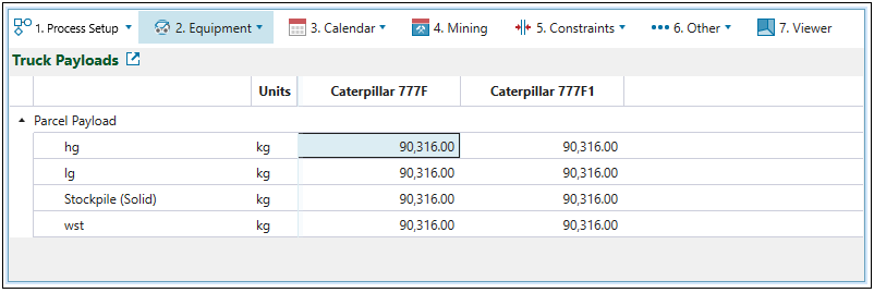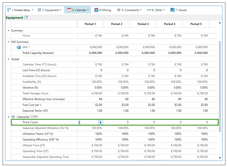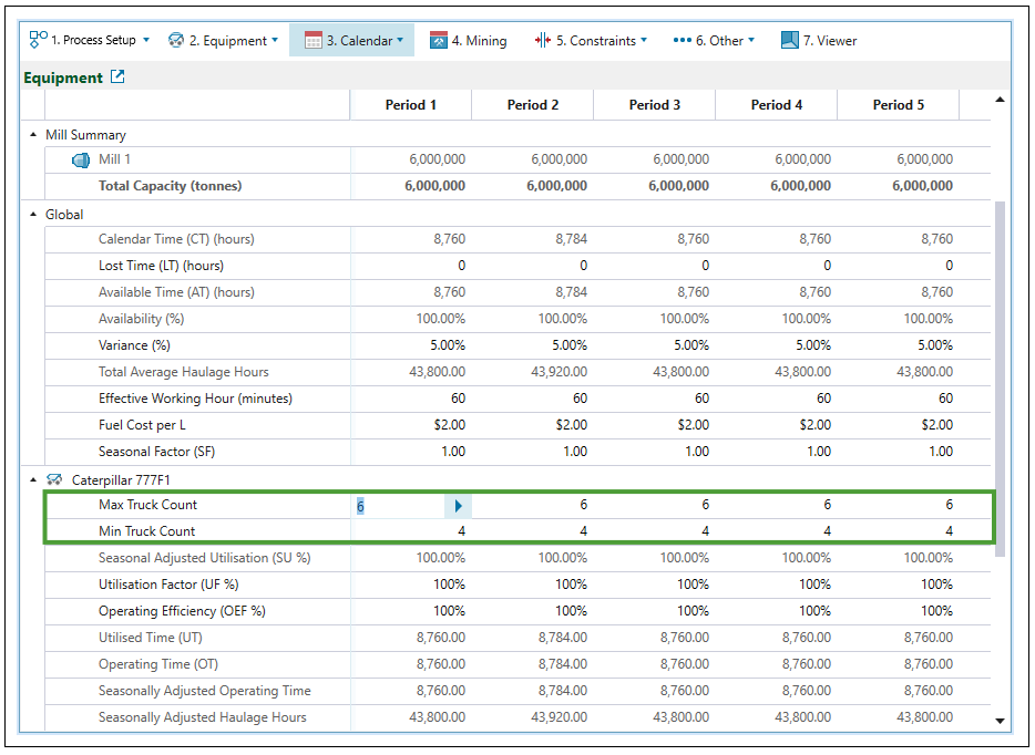 Equipment subtab and set the number of trucks to meet the target for the total mass of material moved at the end of each period. Material extraction will be ordered to use only the configured number of trucks.