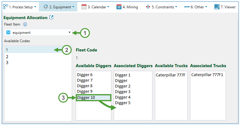 Drag the required diggers or trucks from the corresponding Available columns to the Associated columns.