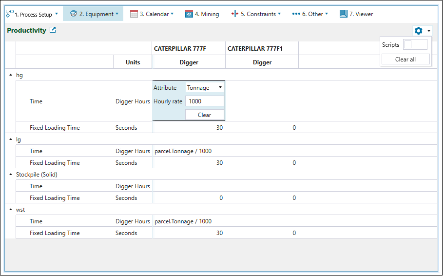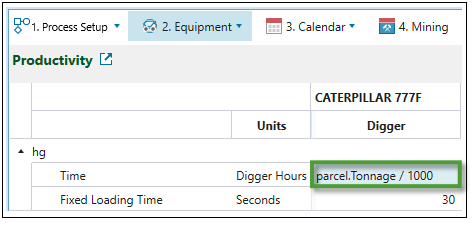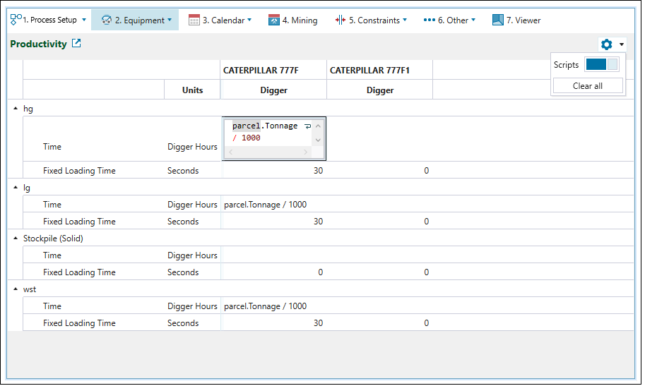 Productivity subtab is used to set the mining duration per parcel for each digger-truck combination. You can choose to either enter a rate which is converted to a duration or use scripting by enabling the scripting slider under the