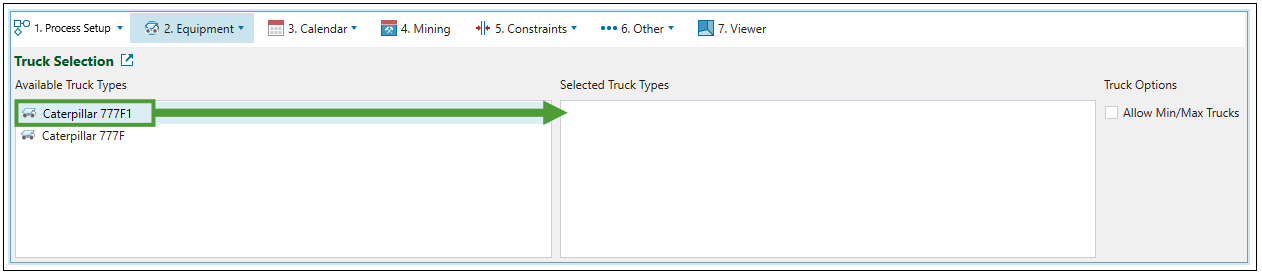 Truck Selection subtab to add truck types defined in your project to your setup. To configure a new truck for the project, see Creating Trucks.