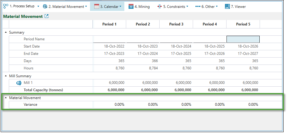 Material Movement target is a variance that is set per period. It is used to control the allowable variance for each period of the schedule from the total material moved, total ore moved, and total equipment hours available in the calendar. A variance of 5% would allow any schedule between 95% and 105% on the calendar maximum to be regarded as not violating the given value. This is used to evaluate how well a given schedule utilised its mills and (or) diggers. Consequently, this value represents the degree of accuracy required when the software is aiming to meet the end of period targets set in the