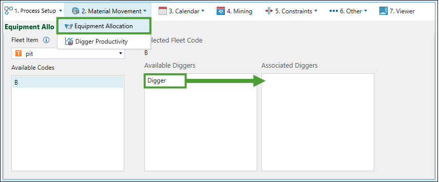 Equipment Allocation tab to assign diggers to regions of the model with specific attribute values. For example, diggers can be assigned to parts of the model based on lithology or stage.