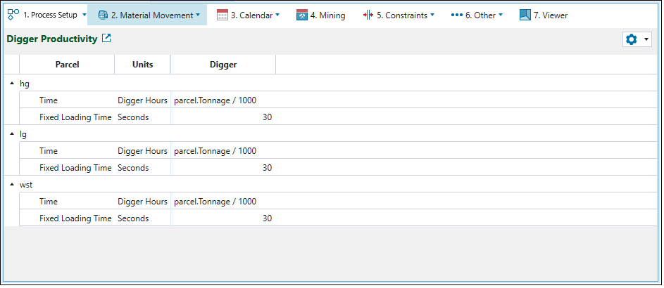 Digger Productivity tab is used to define the rate of material transfer for each digger per parcel. The duration is commonly a parcel-based equation written in a script field. The following is an example of a production duration in digger hours:
