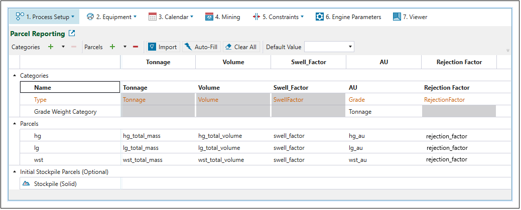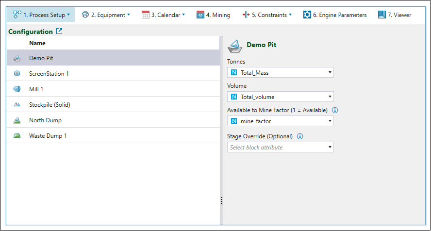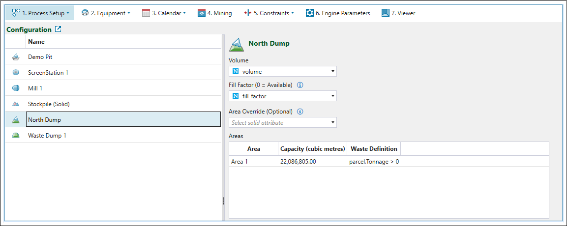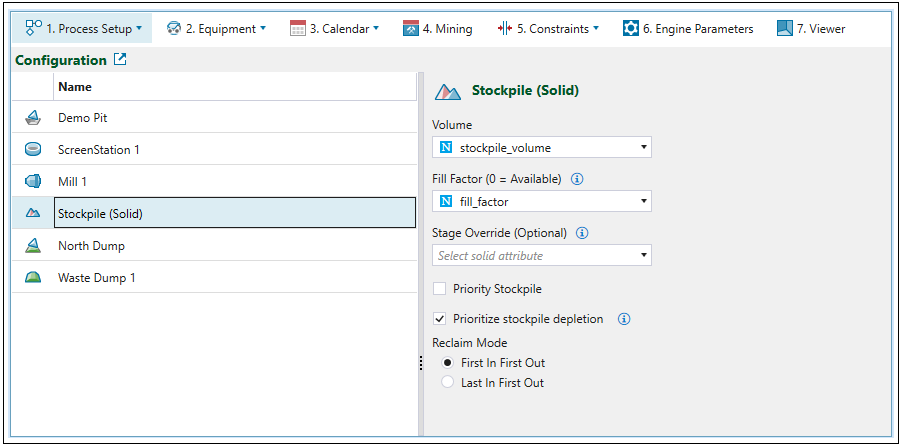 fill_factor = 1indicates that the stockpile is full and cannot be used for storing material. On the other hand, thefill_factor = 0means that the stockpile can accept the material from the pit. Therefore, for the stockpiles to be able to receive material, we recommend that you set the fill factor attribute in your maths scripts to0even for initial stockpiles. -