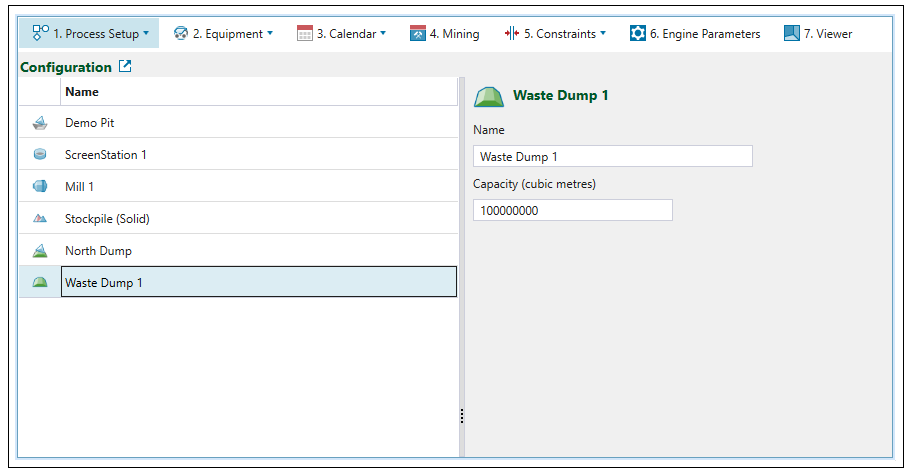 Virtual waste dumps contain no geometrical data and are included when the exact location of waste stored is not critical. The static parameters defined include name and capacity.