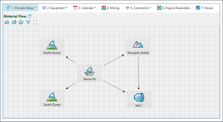 Material Flow subtab is used to define the flow of material within a setup by adding process components and linking them together.