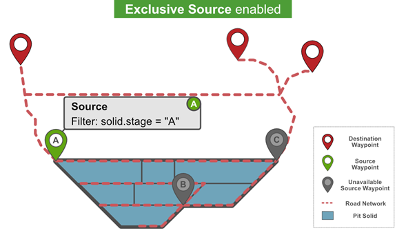 Exclusive Source enabled If you enable Exclusive Source on a waypoint, all material that satisfies the filter criteria (for example, solid.stage == A, as shown on the image below) must pass only through the source waypoint.