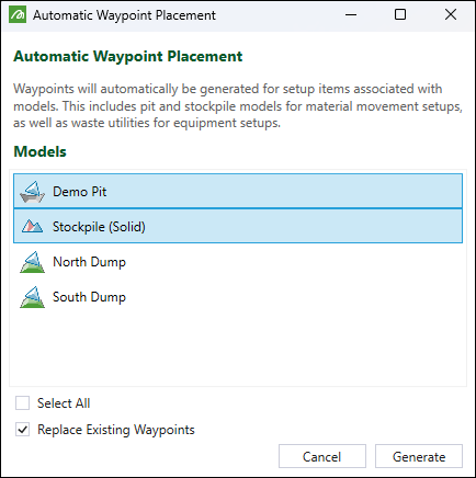 Opens the Automatic Waypoint Placement panel that allows you to automatically generate waypoints for setup items associated with imported models (pits, stockpiles, and waste utilities). You can select multiple models to generate waypoints for. To do so, click to select the required models while pressing the Ctrl key button.