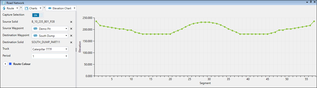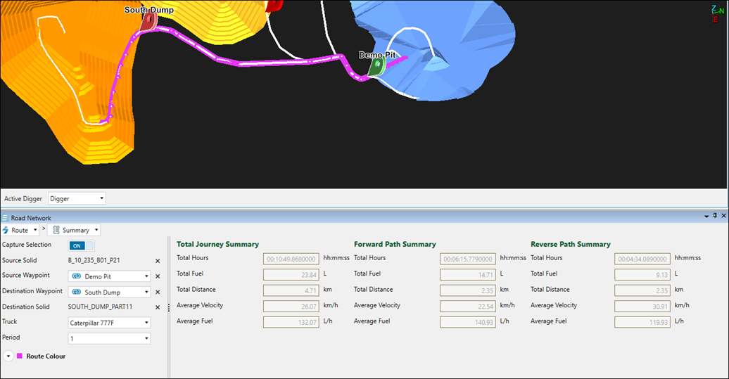 (default setting)In-pit path: The path taken from the source solid, along the bench to the road network, and along the road network until it reaches a source waypoint.