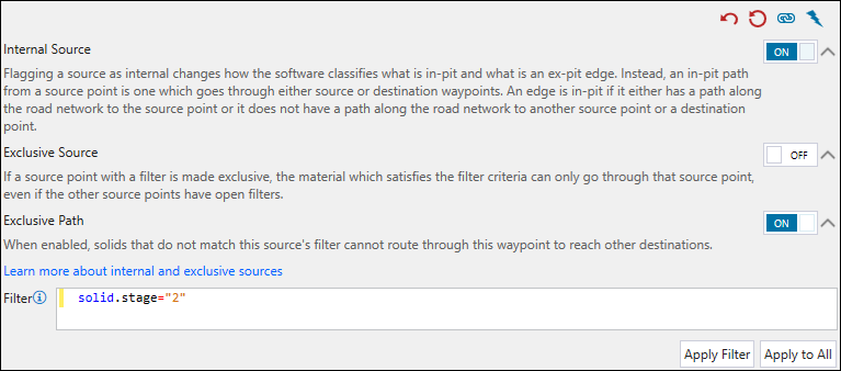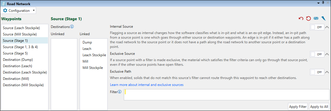 Exclusive Path: Flagging a path as exclusive ensures that an internal waypoint becomes a restrictive control point by preventing material that does not meet its filter conditions from passing through it. This option enforces strict filter behaviour so that material failing the waypoint’s conditions cannot cross that waypoint to reach other destinations. This setting is only applicable to internal sources (see Internal Source above for more information).