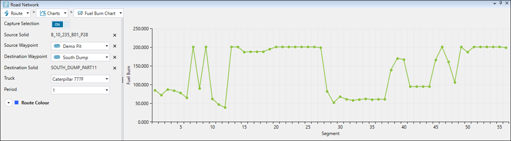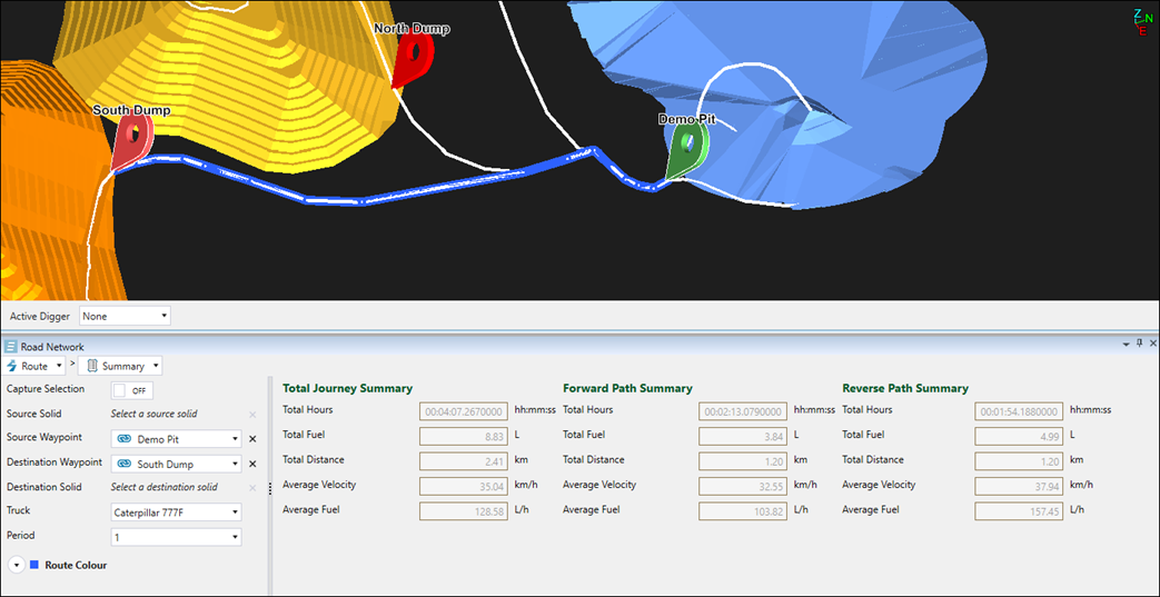 To obtain information on the path between a source and destination solid, enable the Capture Selection by clicking the toggle button. Select the Source Waypoint from the drop-down, and specify the Source Solid by clicking on the required solid on the source model. Next, select the destination waypoint and solid the same way, and specify the truck and the period using the corresponding drop-downs. Evolution will automatically calculate the summary for total, forward and reverse paths, and mark the travelled route in the viewer.