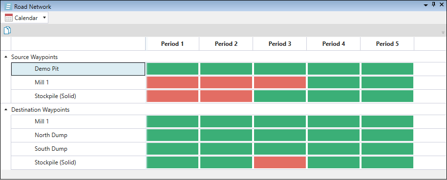 Calendar allows you to flag the availability of source and destination waypoints in each period. A green field indicates that the given waypoint is available in the corresponding period, whereas a red field indicates that the waypoint is unavailable. To change this setting, double-click on the cell and select either Available or Unavailable. To copy your calendar data to the clipboard (so it can be later pasted into another document), click the