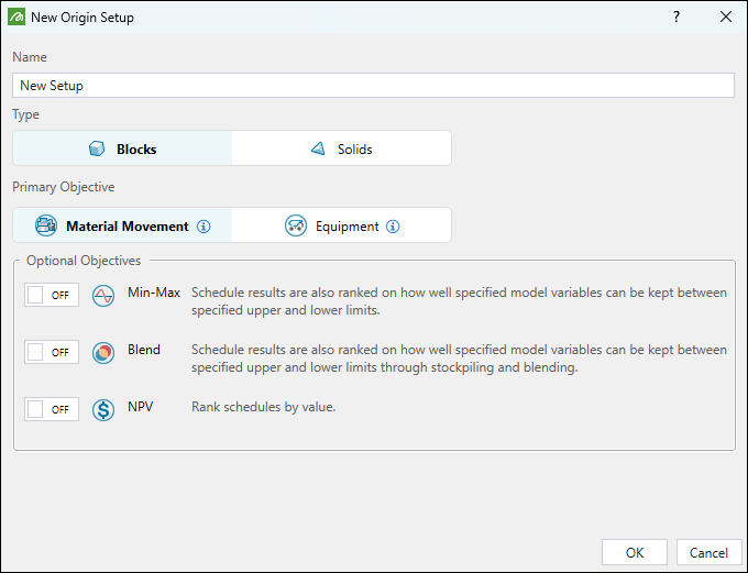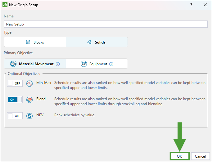 To create an Origin Solids setup, complete the following steps: