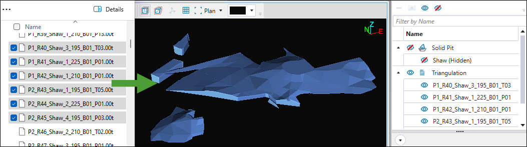 The exported triangulations are categorised into Pit Solids and Waste Solids folders.