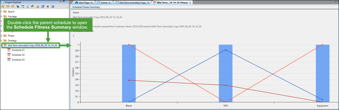Tip: To see the fitness chart that shows the degree of violation of your setup objectives in each period, double-click the parent schedule in the project explorer. Evolution will open Schedule Fitness Summary in the new window.