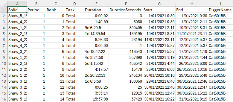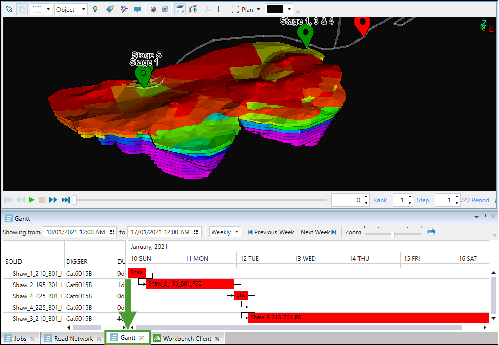 Exporting tasks into a Gantt chart allows you to analyse the mining sequence of your schedule based on a chart where each Gantt task represents one solid being mined. You can find the Gantt tab at the bottom of the viewer panel.
