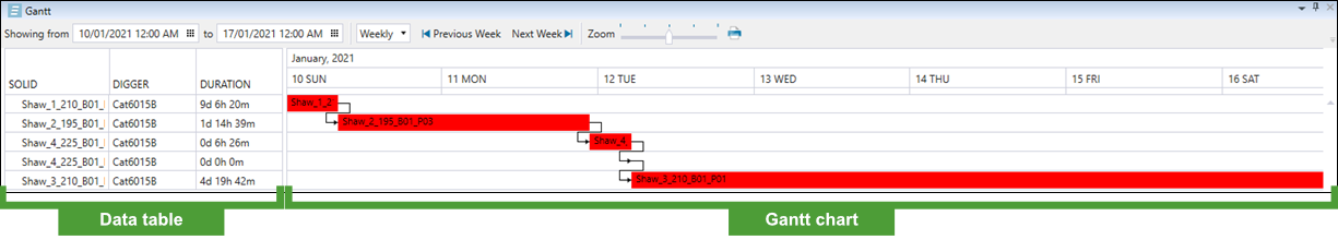The Gantt view represents data in the form of a table and a Gantt chart. The table details each solid, digger, and how long the related digger has worked on the given solid, while the Gantt chart displays the schedule.